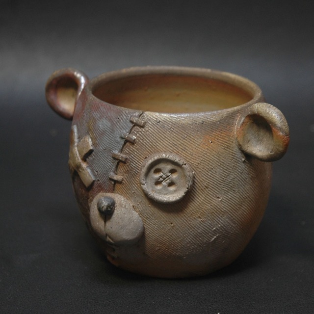 【角窯還元焼成】 ろくろ成型後、表面をくしのような道具でならし、目や耳などのパーツが取り付けられた Bearamicシリーズのレギュラーサイズカップです。 クマをモチーフにした独特のデザインのフリーカップです。 画面向かって左半分には焼成前に含鉄材料が塗布されており、赤褐色の金属色をを呈しています。鼻の黒い部分には、焼成前に黒く発色するように調整された塗り土を施しています。 お手入れは、通常の器と同様で結構ですが、長時間しまう場合にはよく乾燥させてください。 幅:113 ㎜(耳含む) 奥行:90 ㎜ 口径:** ㎜ 高さ:74 ㎜ 容量:*** ml(80%) ※計測はおよその値です。ご了承ください。 作家:内田和彦
