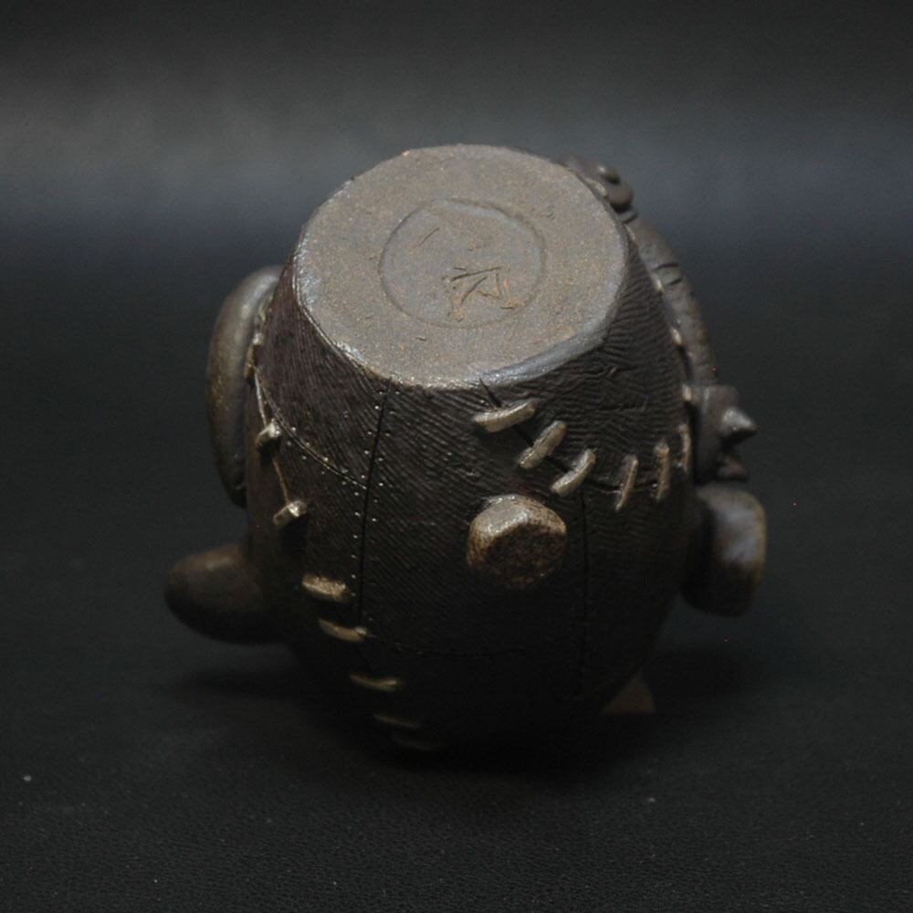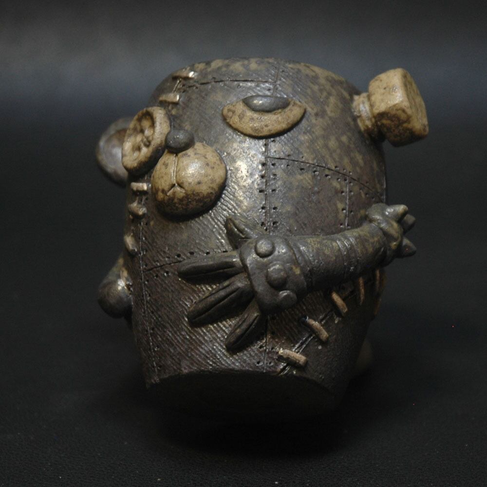 ろくろ成型後、表面をくしのような道具でならし、目や耳などのパーツが取り付けられた
